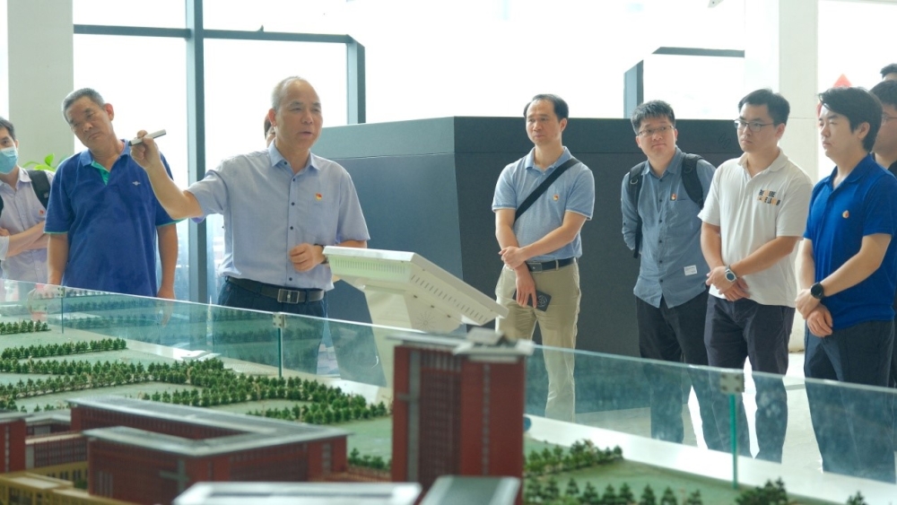 在项目沙盘前,基建处支部书记罗愈业处长带领大家回顾了从签约、设计、土地整备到施工建设的全过程,介绍了深圳校区的规划设计及建设成果。